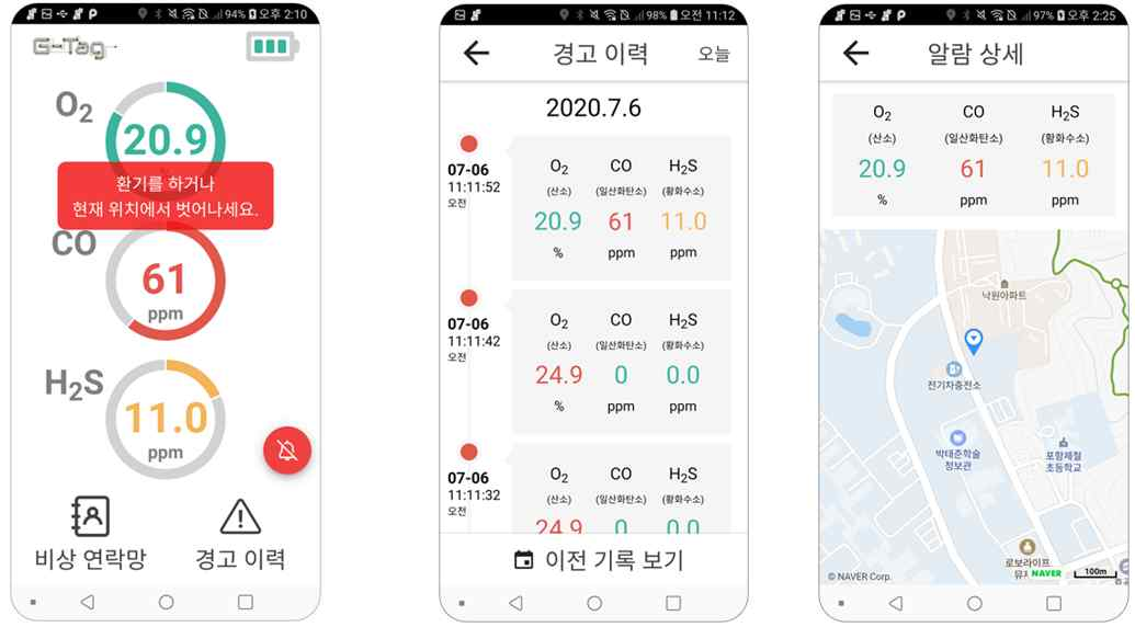 - 경보 이력 확인(경보 발생 시각, 농도, 위치)