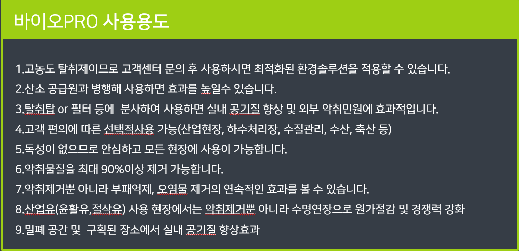 바이오PRO는 각종 유기물을 빠른 시간 내에 분해 시킬 수 있는 활성 미생물이 고밀도로 농축되어 있다. 전분분해효소(Amylase), 단백질분해효소(Protease),섬유질분해효소(Ellulase, Hemicellulase), 지방질 분해효소(Lipase)와 각종 난분해성 물질제거 우수균이 폐수 특성에 적합하도록 고농도로 함유되어 있어 유기물 제거율이 뛰어나며, 간편하게 사용하여 그 효과를 확인할 수 있다.