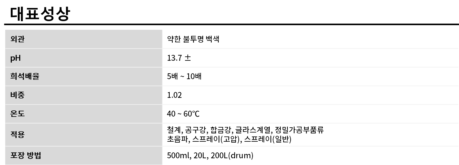 - 수용성 강알칼리 세제로 탁월한 침투 분산력을 지닌 탈지 세정제이며, 내부패성이 우수하며 쉽게 부패하지 않습니다.